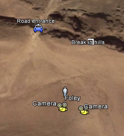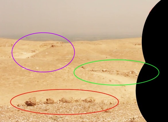 با توجه به تصاویر، فیلم در بالای یک تپه برداشته شده...لبههای این این تپه یا بلندی با دایرهی قرمز مشخص شده... همچنین جادهی خاکی نیز به سادگی قابل تشخصی است که با دایرهی سبز رنگ مشخص شده. محل به یک حالت درهمانند و از جنس سنگ یا امثال ان هم منتهی میشه که با رنگ بنفش مشخص شده...